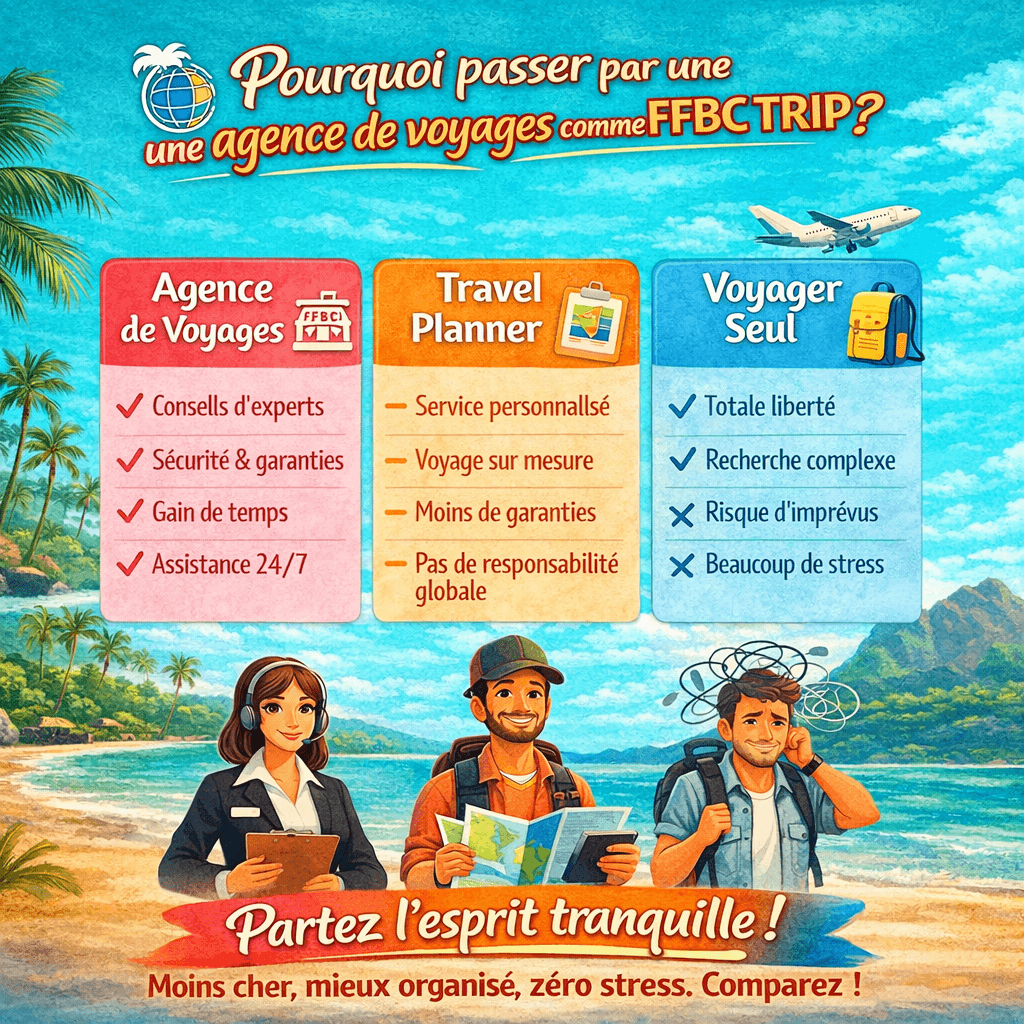 Chez FFBC TRIP, nous ne vendons pas seulement un voyage, nous assumons l’ensemble de l’organisation et des responsabilités associées.